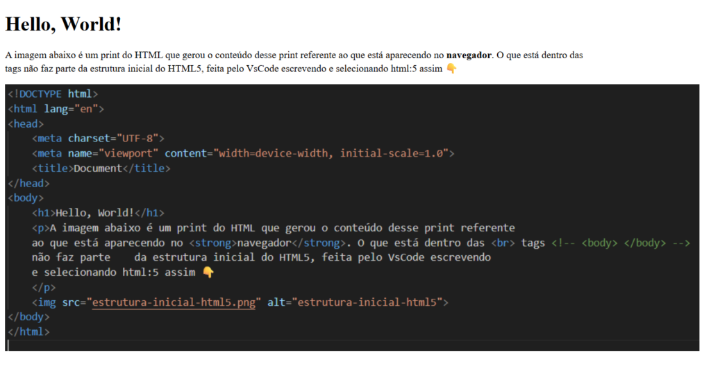 Um arquivo HTML é composto por tags de marcação para indicar ao navegador a estrutura do seu conteúdo. No HTML5, por exemplo (que é a versão que vou utilizar daqui para frente), ao escrever “html:5” e apertar Enter em um arquivo HTML no VS Code, ele gera a estrutura inicial para um arquivo HTML5. A imagem a seguir mostra um print do resultado que aparece no navegador. Nesse print, temos o resultado do código HTML junto com um print do próprio código HTML que gerou esse resultado (?????).